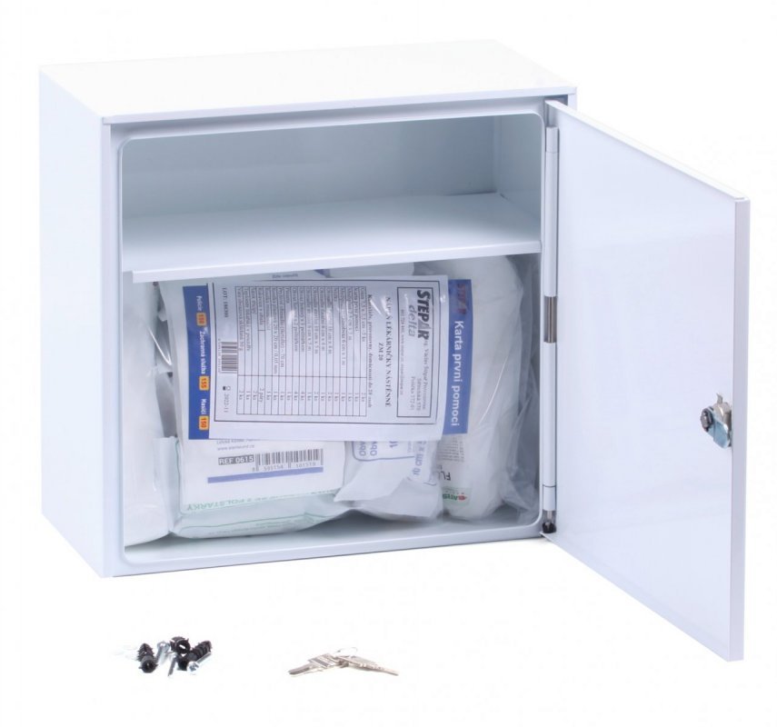 Produkt Nástěnná lékárnička kovová pro 20 osob skladem.