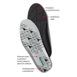 Jsou vyrobeny ze 100procent recyklované antibakteriální a antistatické PU pěny s obsahem aktivního uhlíku, který výborně absorbuje vlhkost. Měkká a zároveň pružná struktura Integrované paměťové pěny, jejíž chování se mění v závislosti na teplotě, se přizpůsobí anatomii nohy a zajistí ideální rozložení tlaků plosky nohy.