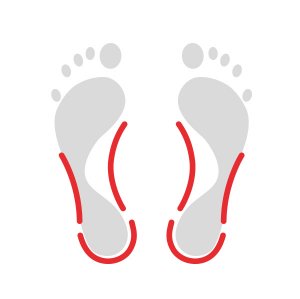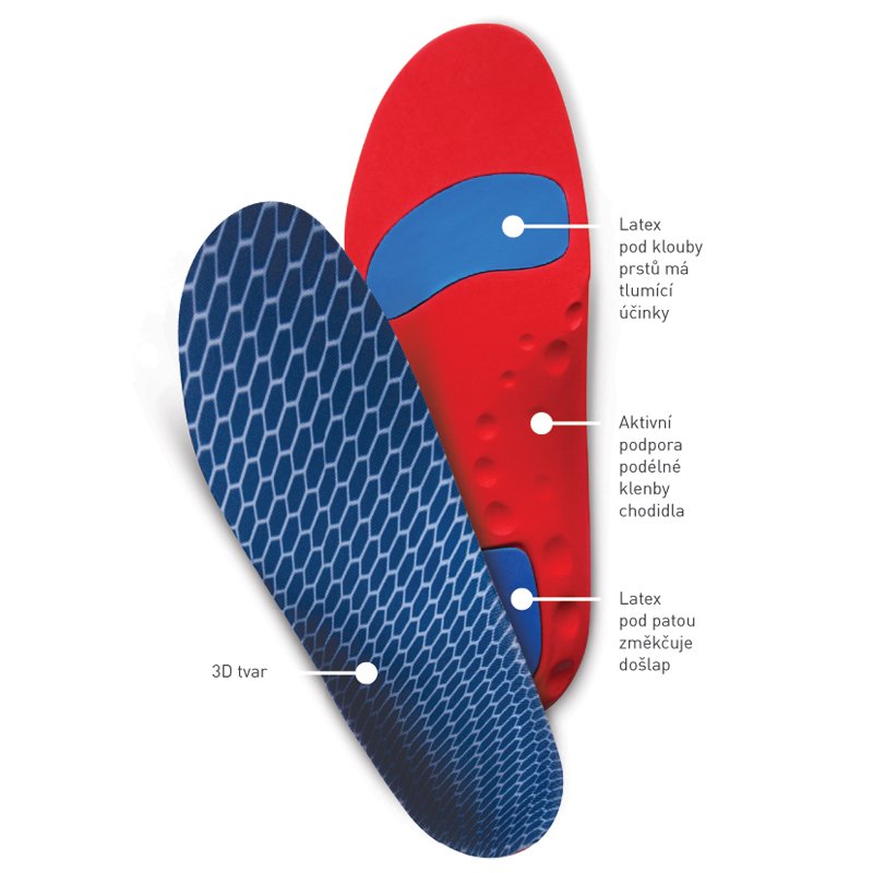 Antišokový materiál pod patou a klouby prstů tlumí nárazy a chrání citlivé části nohy. Vrchní část vložky je potažena textilem.