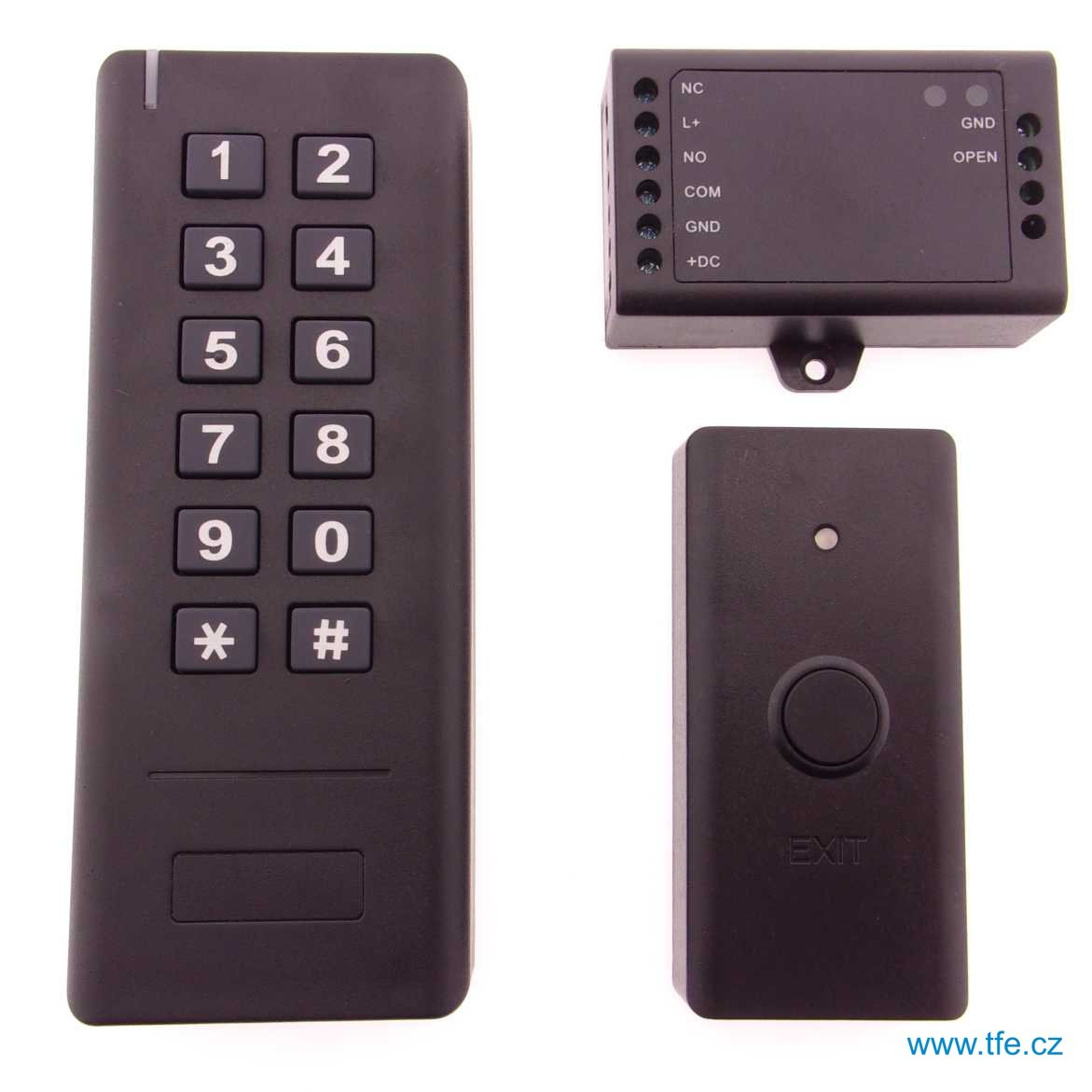 Sada obsahujúca bezdrôtovú klávesnicu s integrovanou čítačkou čipov RFID (štítky, karty, náramky nájdete v našej ponuke TU), poskytujeprijímač s výstupným relé a malým batériovým tlačidlom EXIT na priame ovládanie relé.