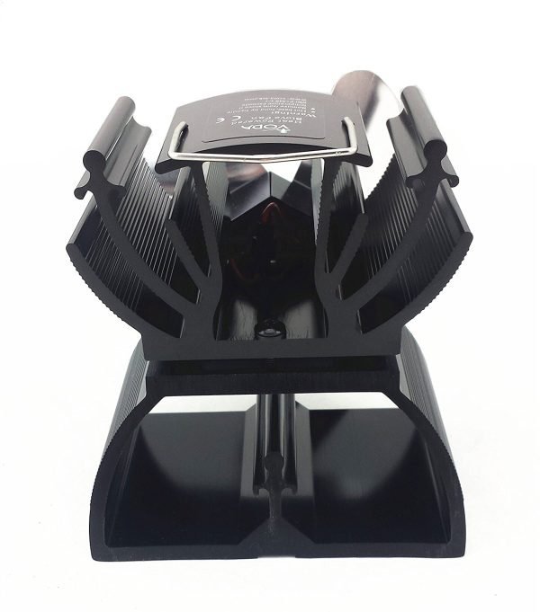 Ak chcete dosiahnuť maximálny výkon, umiestnite ventilátor na hornú časť kachlí pri zadnom okraji, blízko komína. Základňa a vrtuľa ventilátora sú vyrobené z hliníka. Jedinečné eloxované vrtule sú odolné voči korózii a zabezpečujú dokonalú cirkuláciu tepla.